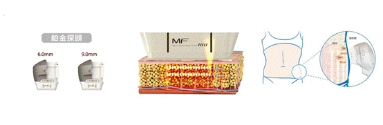 6.0mm和9.0mm超深探頭將音波聚焦作用區域提升八倍,治療面積更大,並可傳遞能量至脂肪層破壞脂肪細胞(圖二)